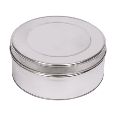 Caja con tapa para guardar herramientas pequeñas (cutters, lamas, boquillas de soldador de aire caliente, etc.). Acero inoxidable. Diámetro 20 cm, grosor 8 cm.